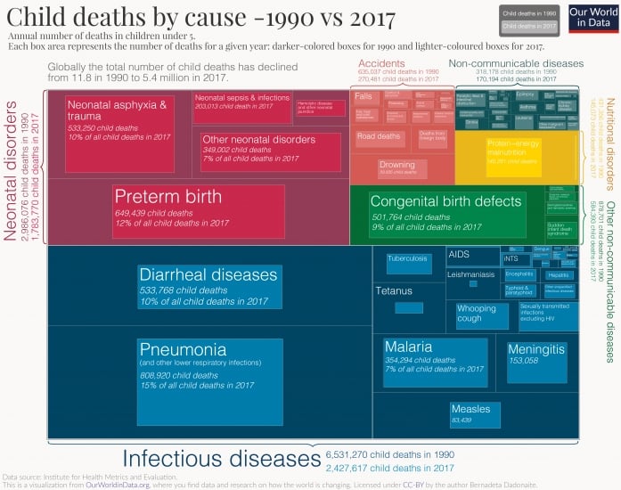 Many leading causes of death receive little mainstream attention. If news reports reflected what children died from, they would say that around 1,400 young children die from diarrheal diseases, 1,000 die from malaria, and 1,900 from respiratory infections – every day.