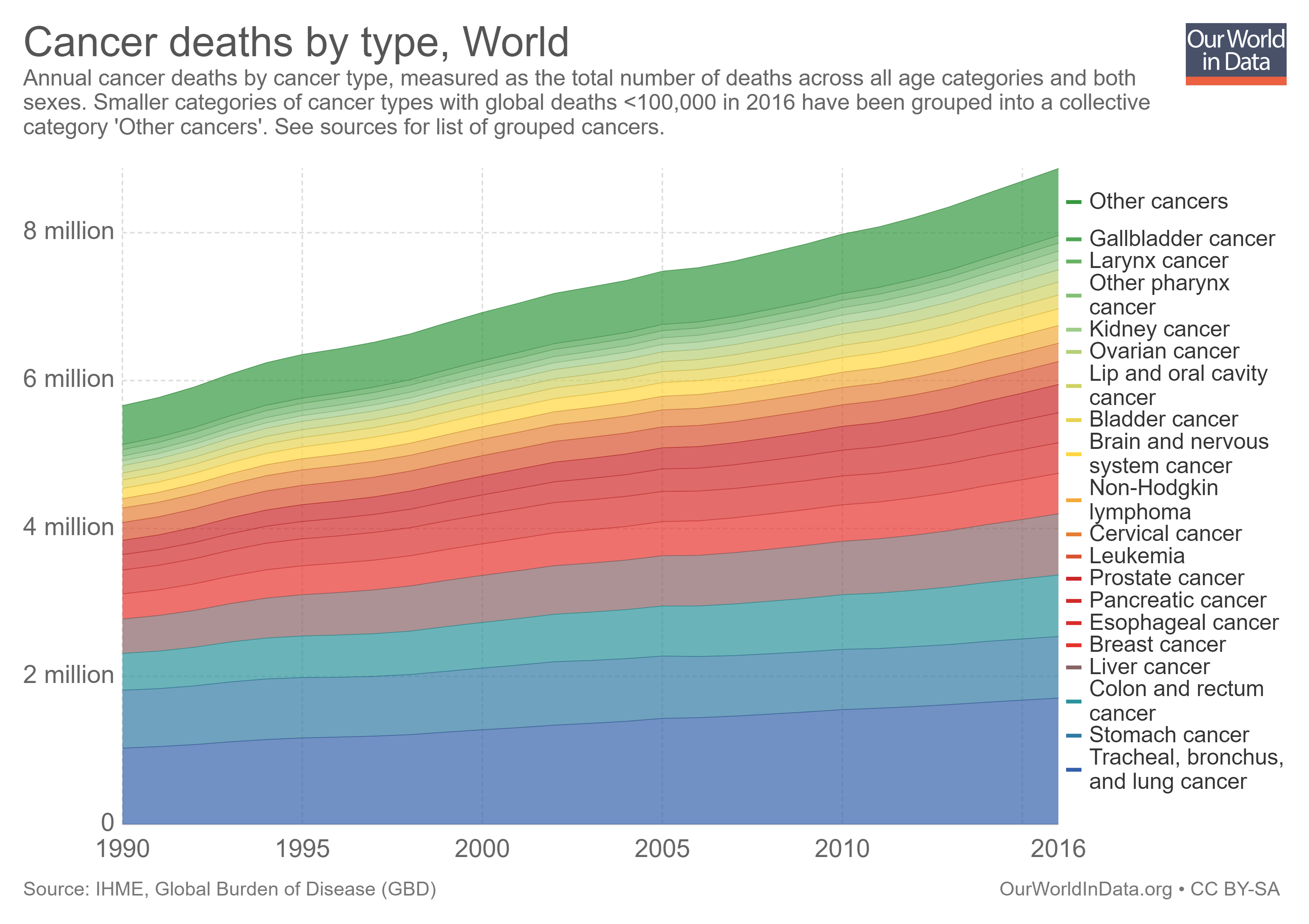 On this page, you will find global data and research on leading causes of death and how they can be prevented. This includes the number of people dying from each cause, their death rates, how they differ between age groups, and their trends over time.