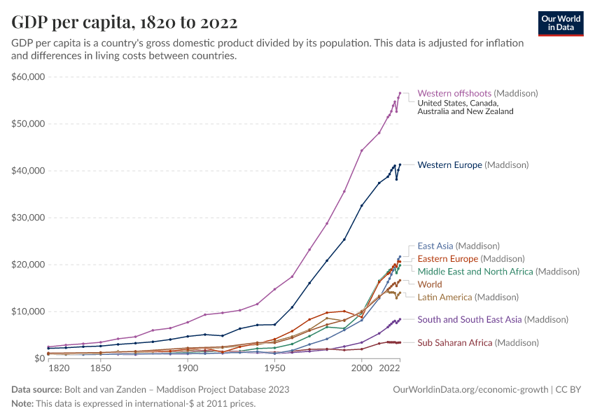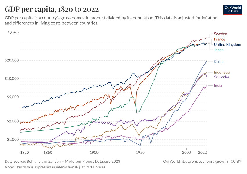 It is also worth keeping in mind that this change has happened while the world population increased 5-fold. Had total global production not increased, the GDP per capita would have declined 5-fold.