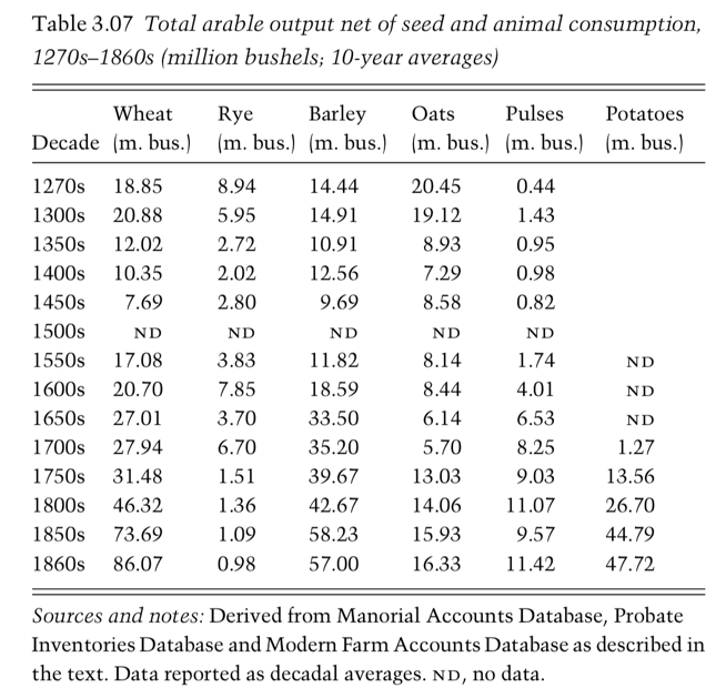 Below is one of the many tables from this book, showing the authors’ estimates of the output of just one part of the agricultural sector of England. This is one of hundreds of datasets that are required to construct the time series in the chart above. And this table – and all others – in turn, build upon a substantial body of historical research.