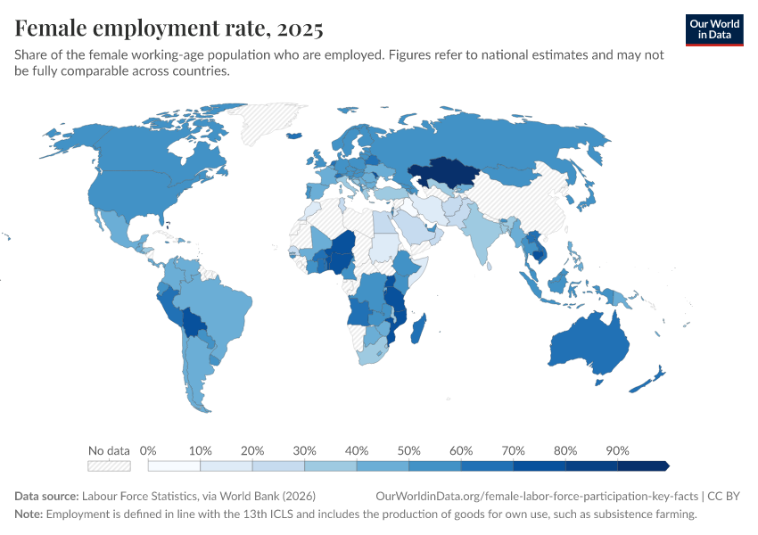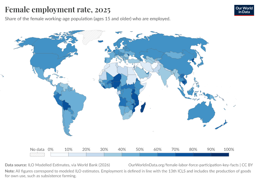 The chart here plots female employment rates across the world (national estimates before ILO corrections). These figures show the number of employed women as a share of the total female working-age population (in both cases, for women ages 15 or older).