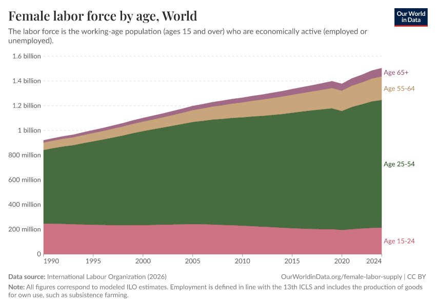 As we can see, today the number of women in the global labor force who are younger than 25 is slightly lower than it was in 2000. However, the total global female labor force grew by almost 40% over the same period.