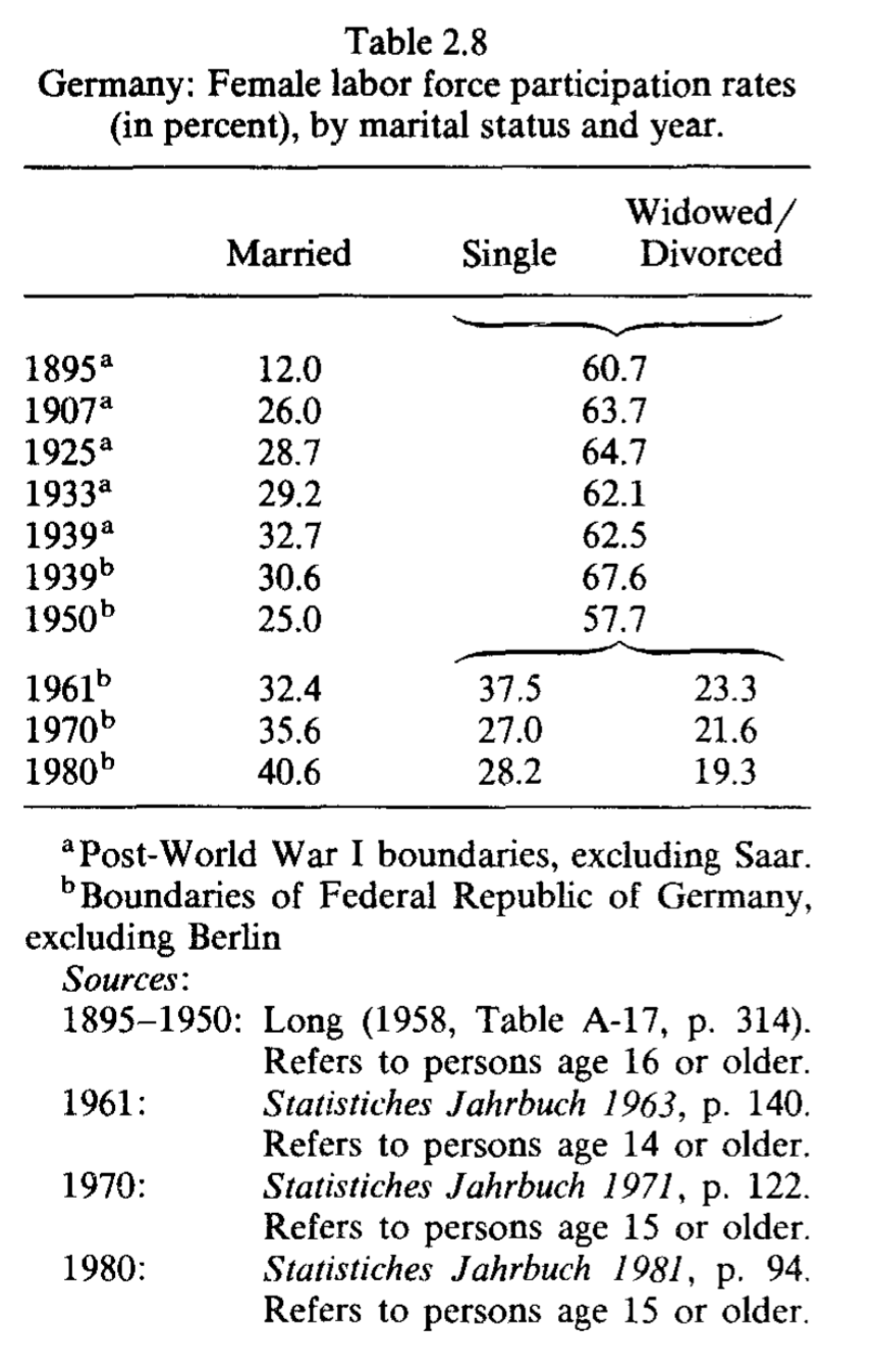 And while it is possible that socially-assigned gender roles emerged in the distant past, our recent and even current practices show that these roles persist with the help of institutional enforcement. Goldin (1988), for instance, examines past prohibitions against the training and employment of married women in the US.34 She touches on some well-known restrictions, such as those against the training and employment of women as doctors and lawyers, before focusing on the lesser known but even more impactful "marriage bars" that arose in the late 1800s and early 1900s. These work prohibitions are important because they applied to teaching and clerical jobs — occupations that would become the most commonly held among married women after 1950. Around the time the US entered World War II, it is estimated that 87% of all school boards would not hire a married woman and 70% would not retain an unmarried woman who married.