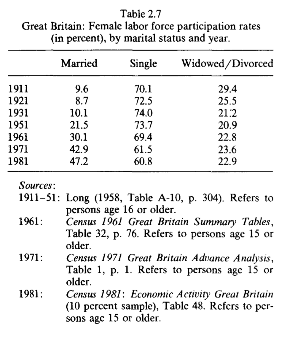 As an example, the chart here shows female labor force participation rates in the US, by marital status.3 As we can see, the marked upward trend observed for the general female population is mainly driven by the trend among married women. Heckman and Killingsworth (1986) provide evidence of similar historical trends for the UK, Germany, and Canada.4
