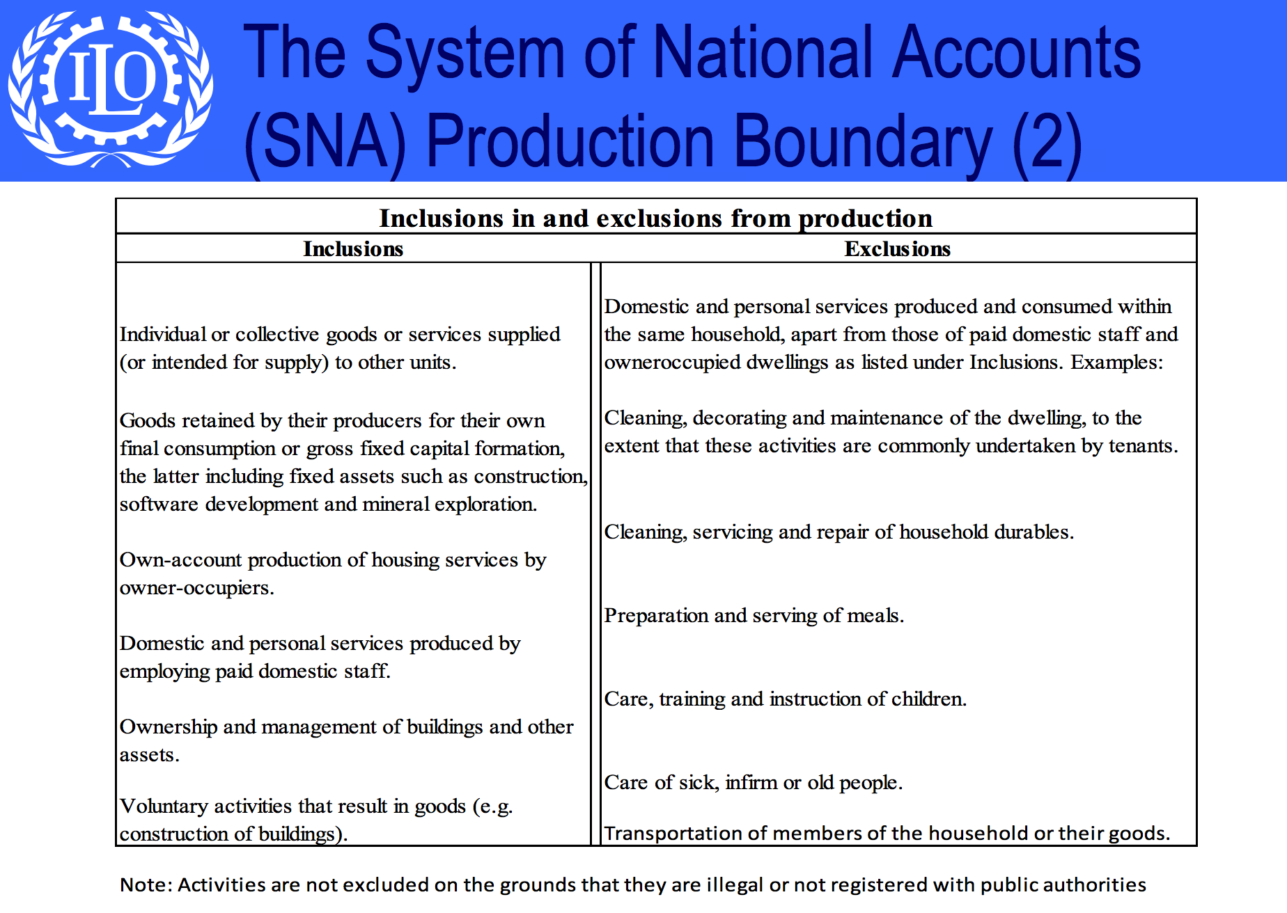 In the guidelines stipulated by the ILO, employment also includes self-employment. In principle, the labor force therefore includes anyone who supplies labor for the production of economic goods and services, independently of whether they do so for pay, profit, or family gain.7 The ILO shows an overview of what counts and what doesn’t towards producing “economic goods and services”.8