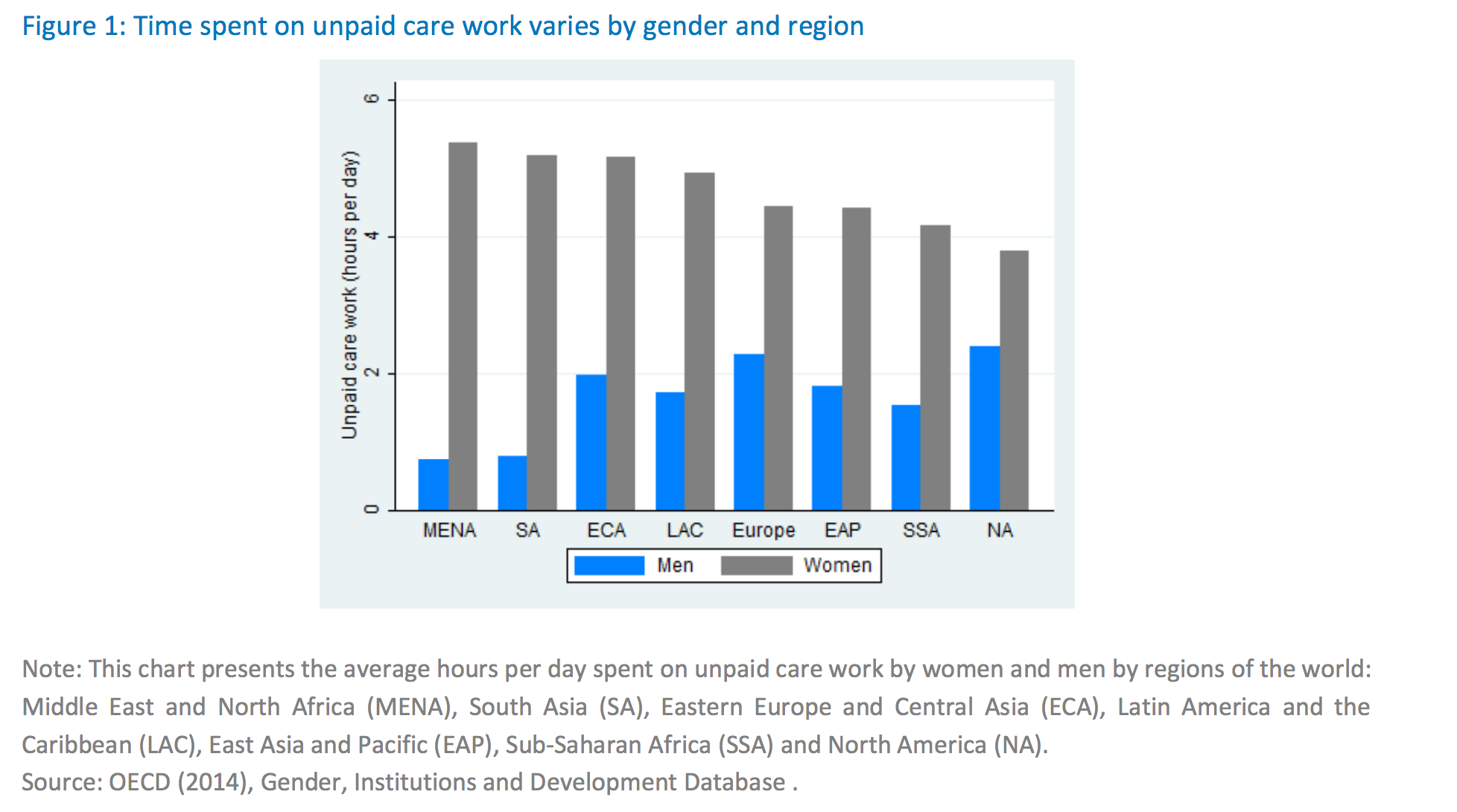 Another chart provides a sense of perspective on the levels by regions. In the MENA region, where the gap tends to be largest, women spend on average over 5 hours on unpaid care work per day, while men spend less than one hour.16