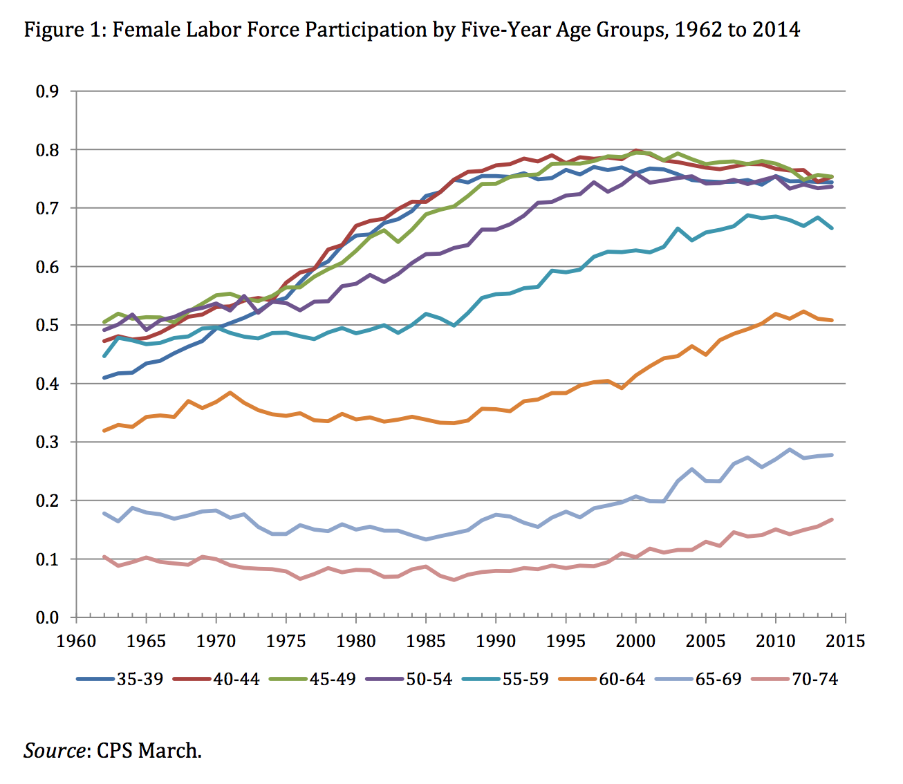 The recent decline in female labor force participation in the US has received attention in a number of recent academic studies. Importantly, Goldin & Katz (2016) show that the overall trend of decreasing female participation in the US masks important cohort trends. In particular, they show that a large share of American women are working much longer today than previous generations — well into their 60s and 70s — and working full-time.