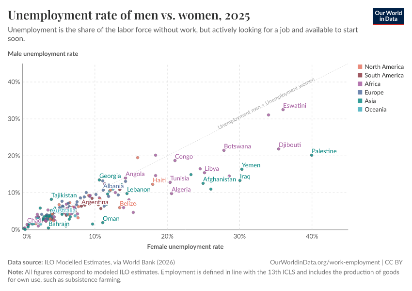 On the right-hand side of the chart, most countries lie significantly above the diagonal line — so in countries where unemployment is more common, women tend to be disproportionately affected.