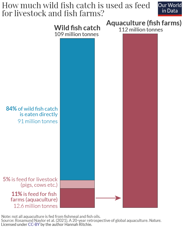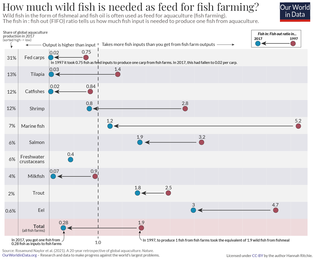 Again, we should be careful not to mistake this as the total feed conversion ratio (FCR). Fish farms are fed from other sources. This ratio tells us about fish input, which is only one part of their total diet.