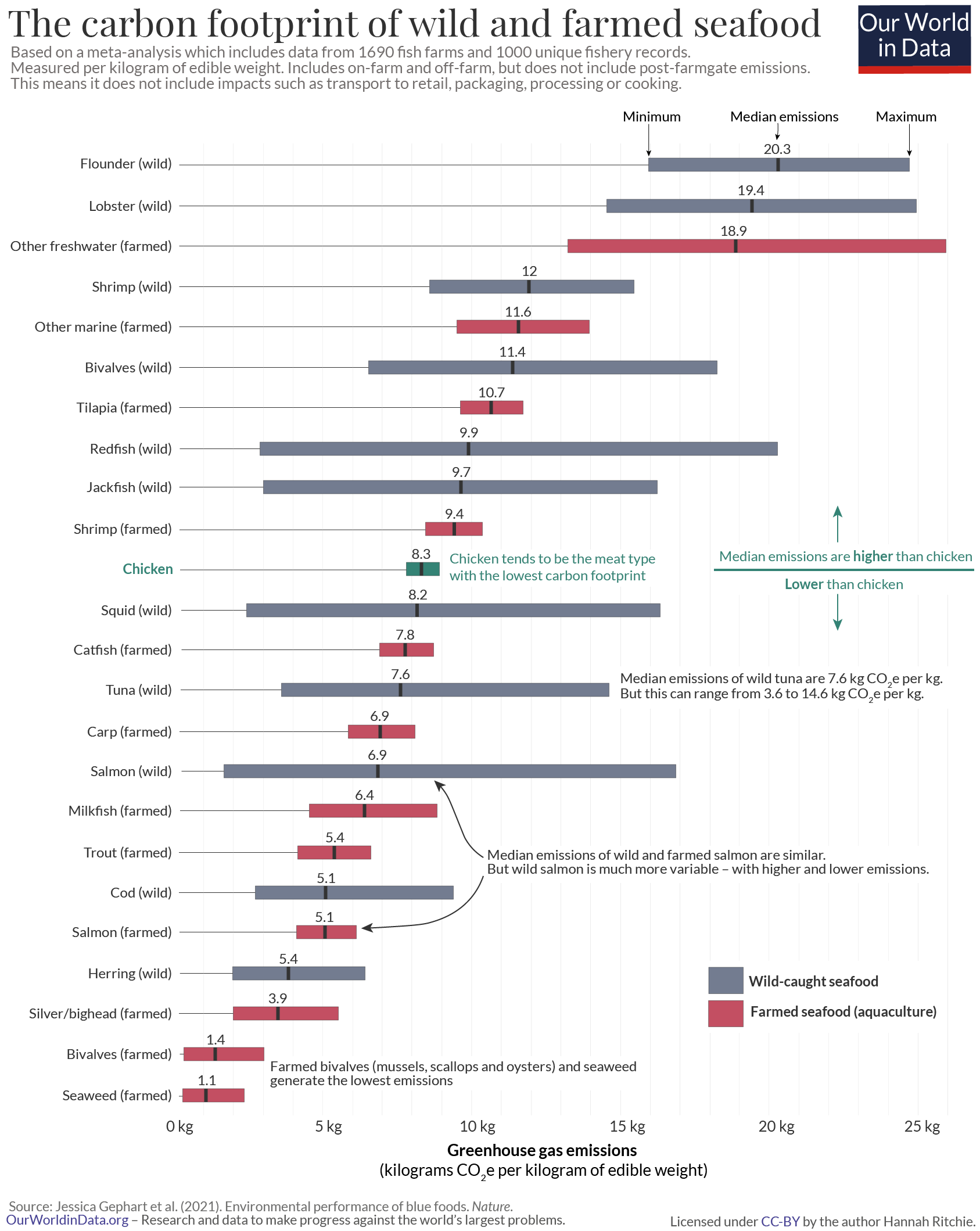 Our comparison of greenhouse gas emissions includes both wild-caught seafood and seafood from fish farms. Land use, nitrogen and phosphorus emissions, and freshwater use are only shown for farmed seafood – wild-caught fish do not really create these environmental impacts. Farmed fish do require land and can produce nutrient pollution from the production of feed to grow them.