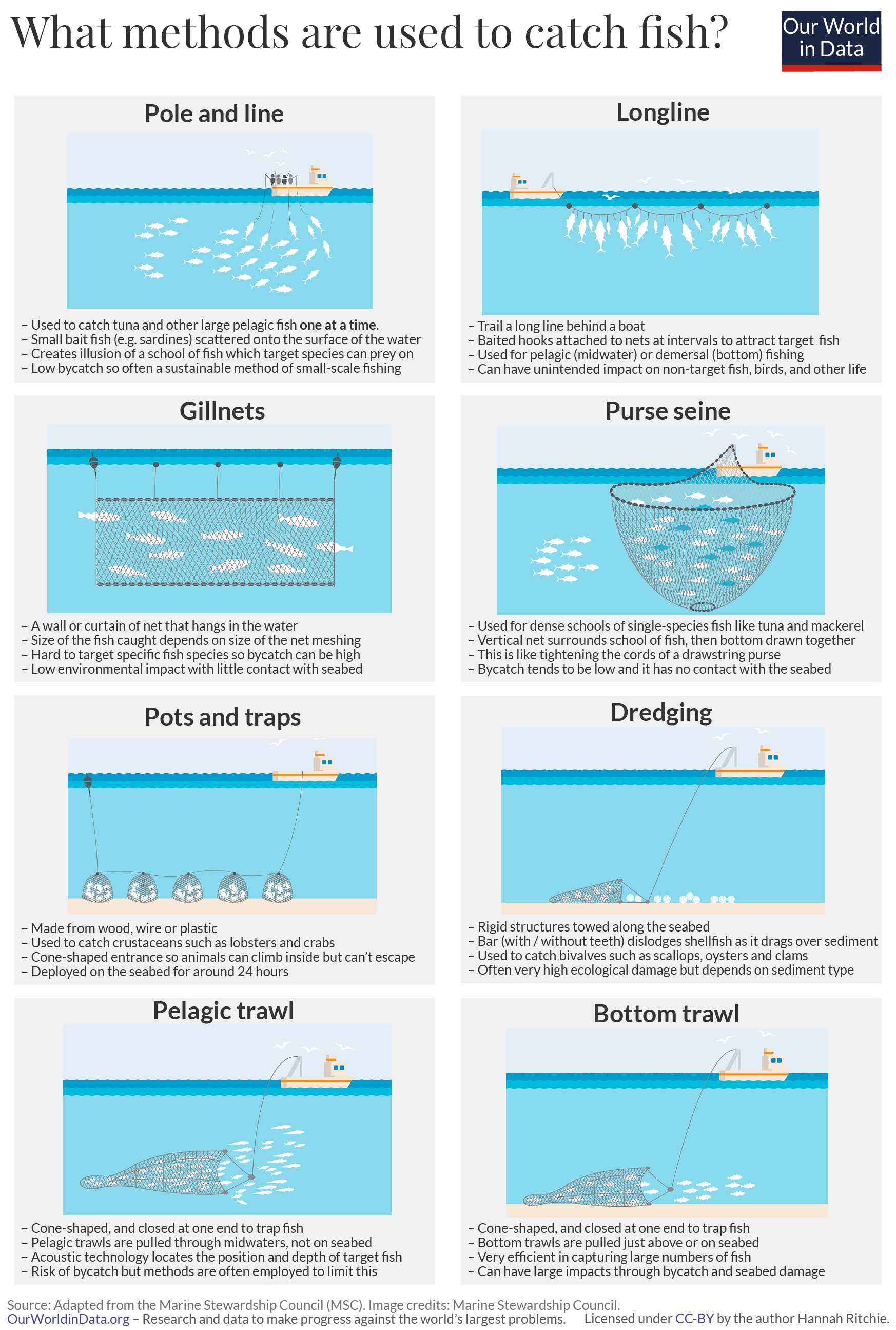 There are a variety of ways to catch fish. These matters because they depend on what fish we want to catch, how much fish we can catch (and ultimately, the amount of fish we have to eat and the income fishers get), and what the ecological impacts are.