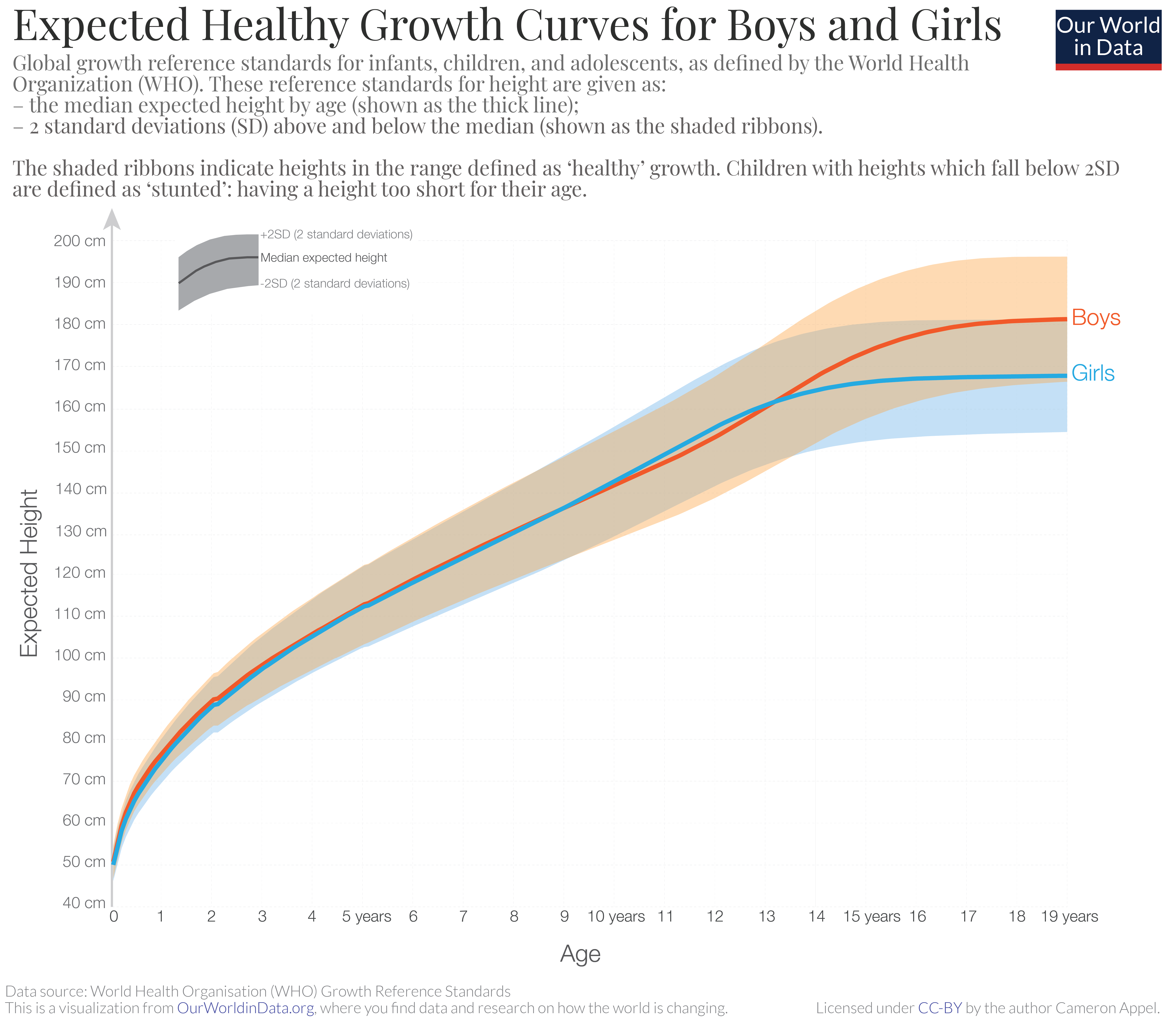 As we’ve previously explored, the average man is taller than the average woman: this is seen across all countries in the world. But when does this differentiation in heights take place? How do the growth trends for boys and girls in childhood differ?