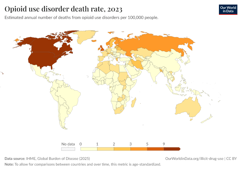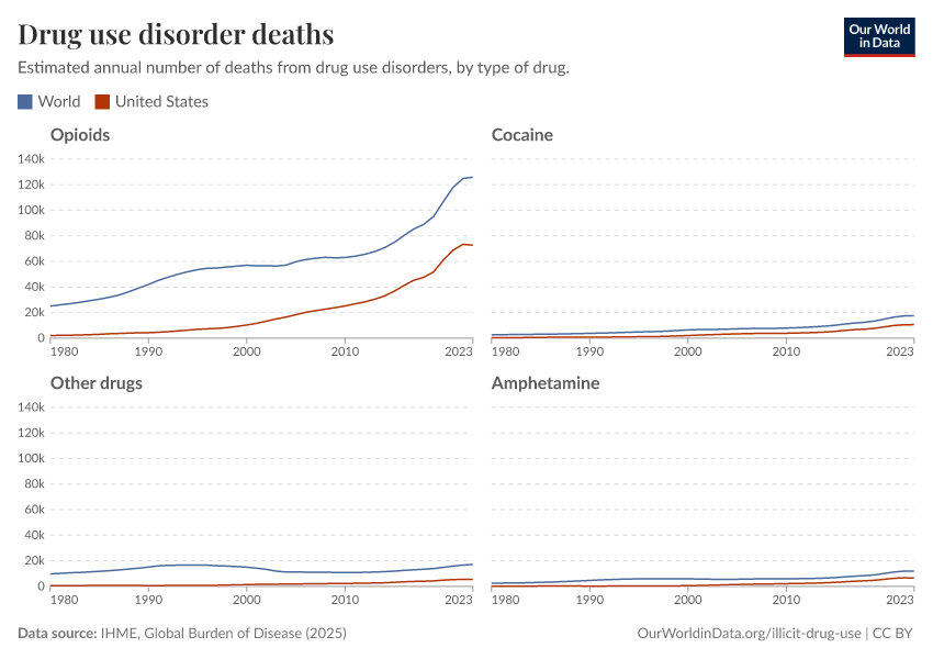 Hannah Ritchie, Pablo Arriagada, and Max Roser (2022) - “Opioids, Cocaine, Cannabis, and Other Illicit Drugs” Published online at OurWorldinData.org. Retrieved from: 'https://ourworldindata.org/illicit-drug-use' [Online Resource]BibTeX citation