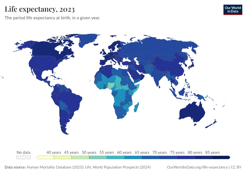 Saloni Dattani, Lucas Rodés-Guirao, Hannah Ritchie, Esteban Ortiz-Ospina, and Max Roser (2023) - “Life Expectancy” Published online at OurWorldinData.org. Retrieved from: 'https://ourworldindata.org/life-expectancy' [Online Resource]BibTeX citation