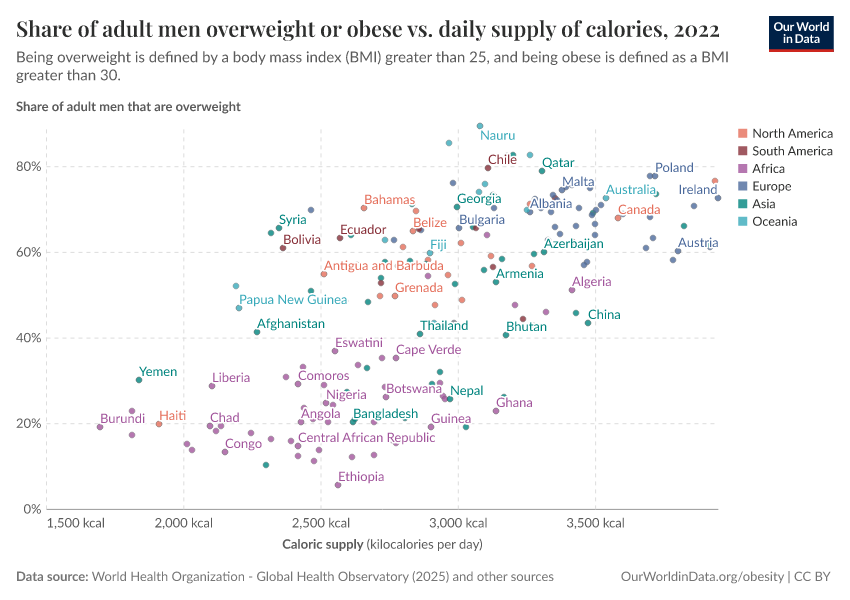 In the chart here, we see the relationship between the share of men who are overweight or obese versus the daily average supply of kilocalories per person.
