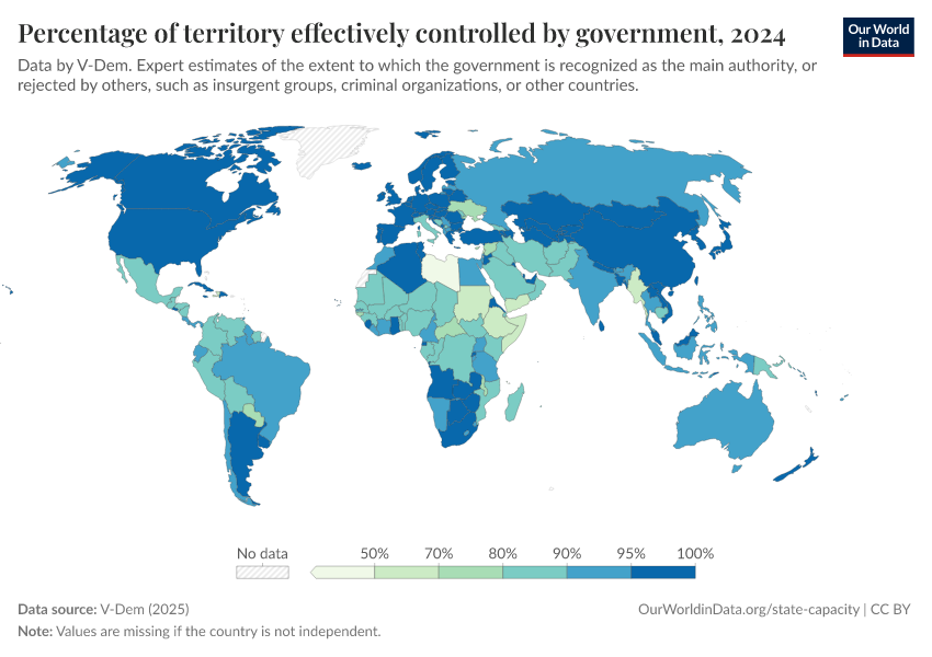 We see that most countries control all or almost all of their territory. In them, the government is recognized as the main authority practically everywhere and can assert its power — sometimes by force — over actors that reject its authority.