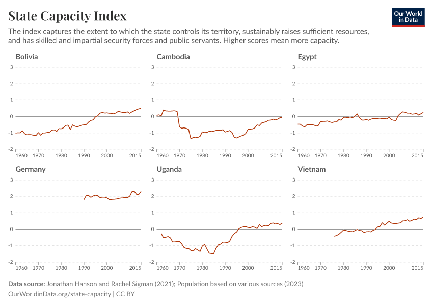 A large majority of countries across the world have improved their score over the last decades. This particularly happened in countries with previously lower levels of state capacity, such as Uganda and Vietnam. But it has even happened in those with already high capacity, such as Germany.