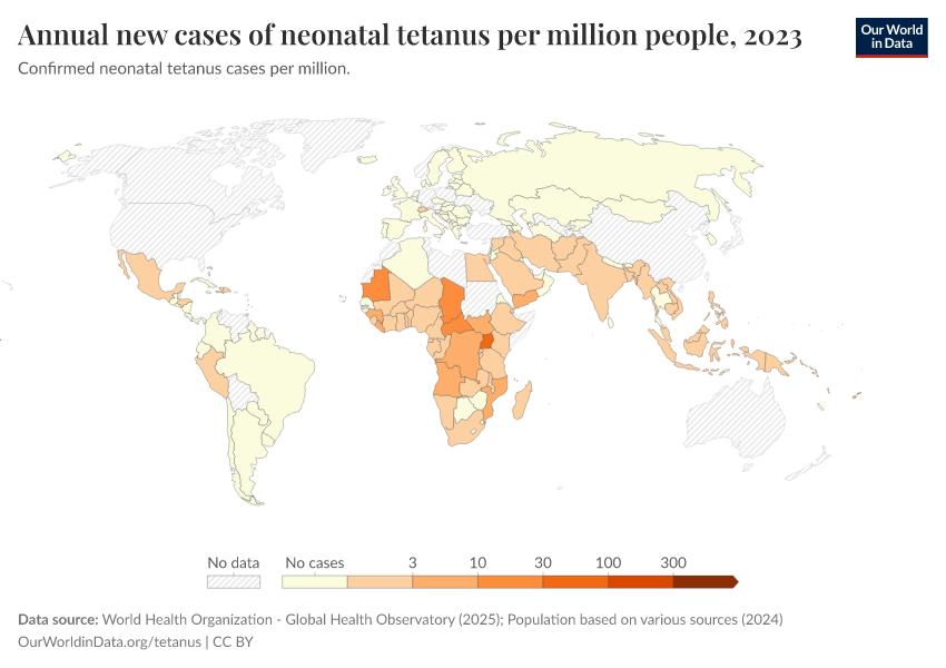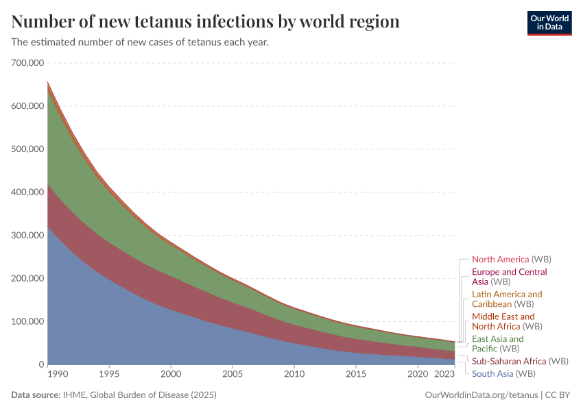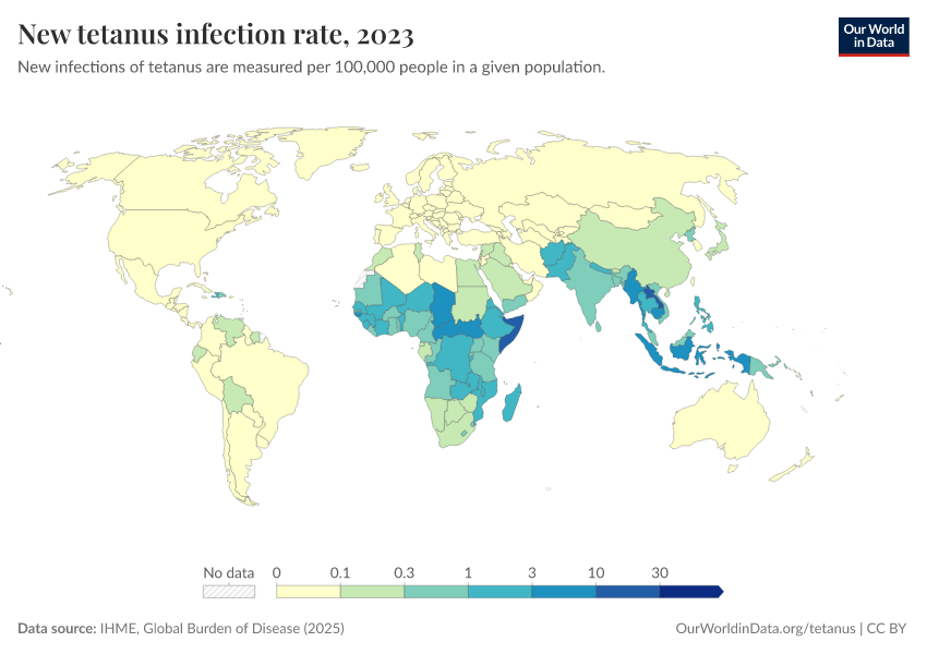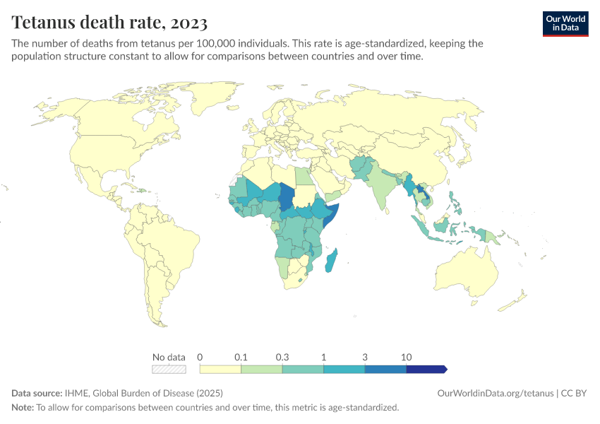 Hannah Behrens, Sophie Ochmann, Bernadeta Dadonaite, and Max Roser (2019) - “Tetanus” Published online at OurWorldinData.org. Retrieved from: 'https://ourworldindata.org/tetanus' [Online Resource]