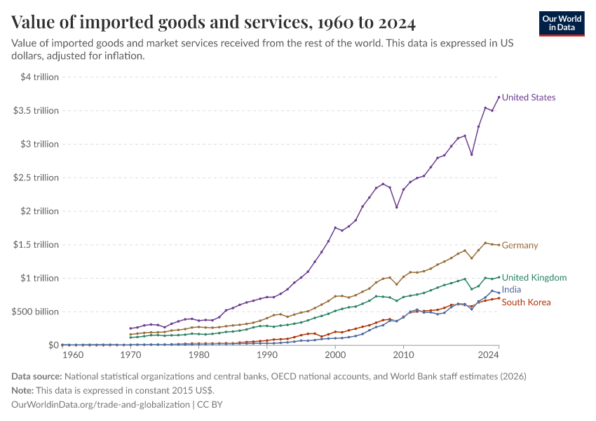To understand how globalization looks today, we now turn from long-run historical sources to data that national statistical offices update regularly. These figures are derived from modern trade records, customs data, and international databases. With this data, we can track current patterns in trade volumes, trade composition, and trading partners. (You can read more about data sources and measurement issues at the end of this page.)